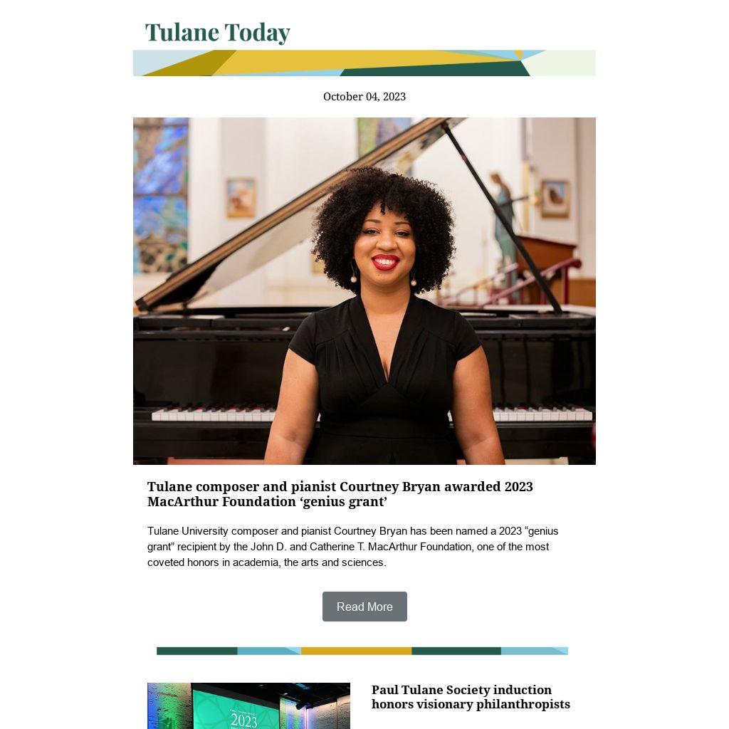 | | | | Tulane University composer and pianist Courtney Bryan has been named a 2023 “genius grant” recipient by the John D. and Catherine T. MacArthur Foundation, one of the most coveted honors in academia, the arts and sciences.  |