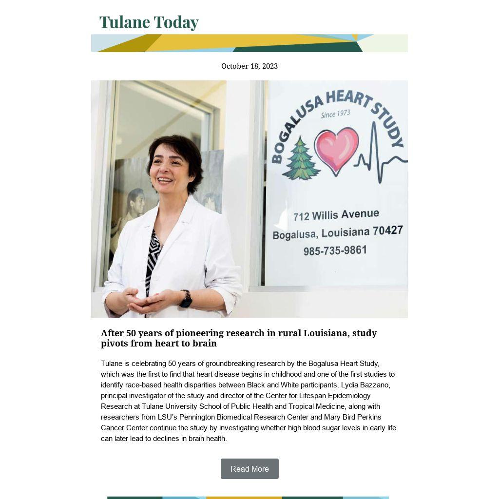 Tulane is celebrating 50 years of groundbreaking research by the Bogalusa Heart Study, which was the first to find that heart disease begins in childhood and one of the first studies to identify race-based health disparities between Black and White participants. Lydia Bazzano, principal investigator of the study and director of the Center for Lifespan Epidemiology Research at Tulane University School of Public Health and Tropical Medicine, along with researchers from LSU’s Pennington Biomedical Research Center and Mary Bird Perkins Cancer Center continue the study by investigating whether high blood sugar levels in early life can later lead to declines in brain health.