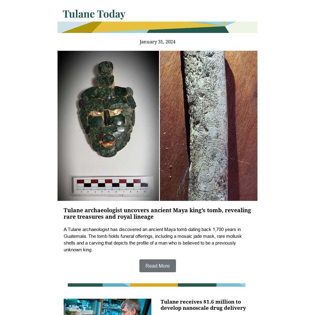 A Tulane archaeologist has discovered an ancient Maya tomb dating back 1,700 years in Guatemala. The tomb holds funeral offerings, including a mosaic jade mask, rare mollusk shells and a carving that depicts the profile of a man who is believed to be a previously unknown king.