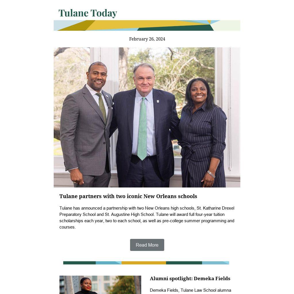 Tulane has announced a partnership with two New Orleans high schools, St. Katharine Drexel Preparatory School and St. Augustine High School. Tulane will award full four-year tuition scholarships each year, two to each school, as well as pre-college summer programming and courses.