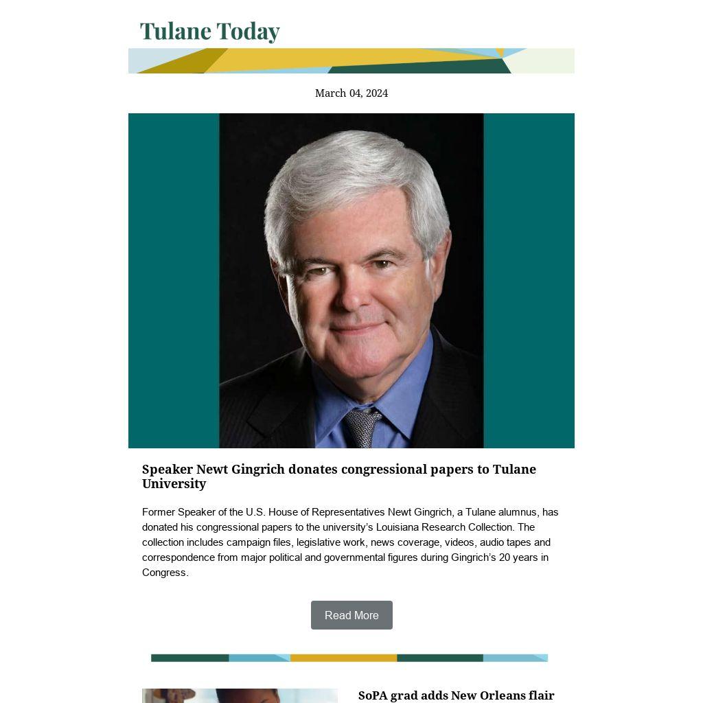 Former Speaker of the U.S. House of Representatives Newt Gingrich, a Tulane alumnus, has donated his congressional papers to the university’s Louisiana Research Collection. The collection includes campaign files, legislative work, news coverage, videos, audio tapes and correspondence from major political and governmental figures during Gingrich’s 20 years in Congress.