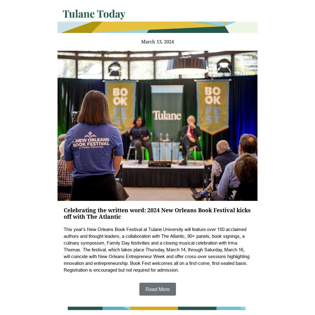 Several Tulane faculty, staff and alumni will be part of this year’s Book Fest sessions discussing a variety of engaging topics. Visit the Tulane News website to see a full list of Tulanians and the schedule of their sessions.