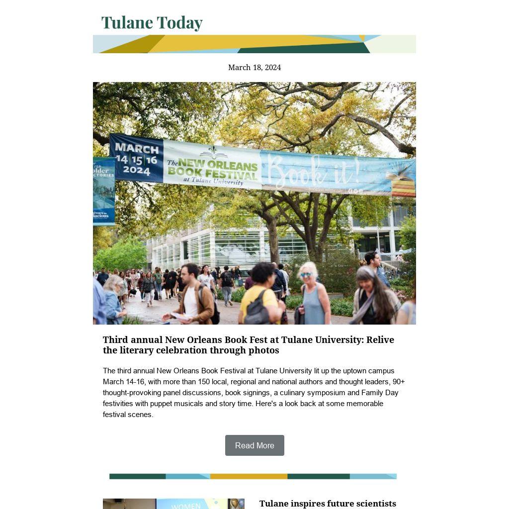 We are seeking nominations of graduates with inspirational stories to be featured in Tulane Today in the days leading up to the Unified Commencement Ceremony on Saturday, May 18. To nominate a graduate for a Commencement profile, fill out this form with the graduate’s name, school, major, contact information and a few sentences describing why they should be profiled. The nomination period is open through Tuesday, April 2. Visit the Tulane News website for more information.
