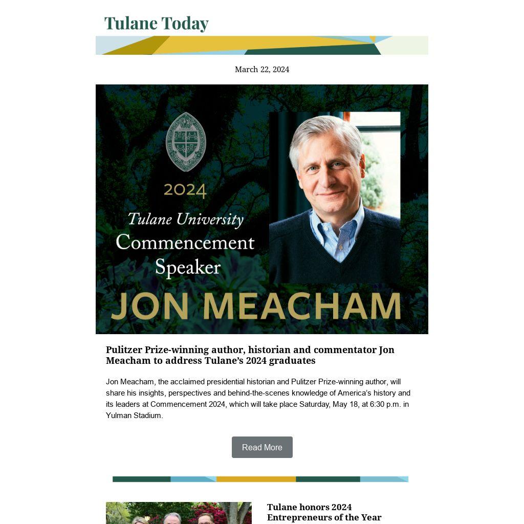 Jon Meacham, the acclaimed presidential historian and Pulitzer Prize-winning author, will share his insights, perspectives and behind-the-scenes knowledge of America’s history and its leaders at Commencement 2024, which will take place Saturday, May 18, at 6:30 p.m. in Yulman Stadium.