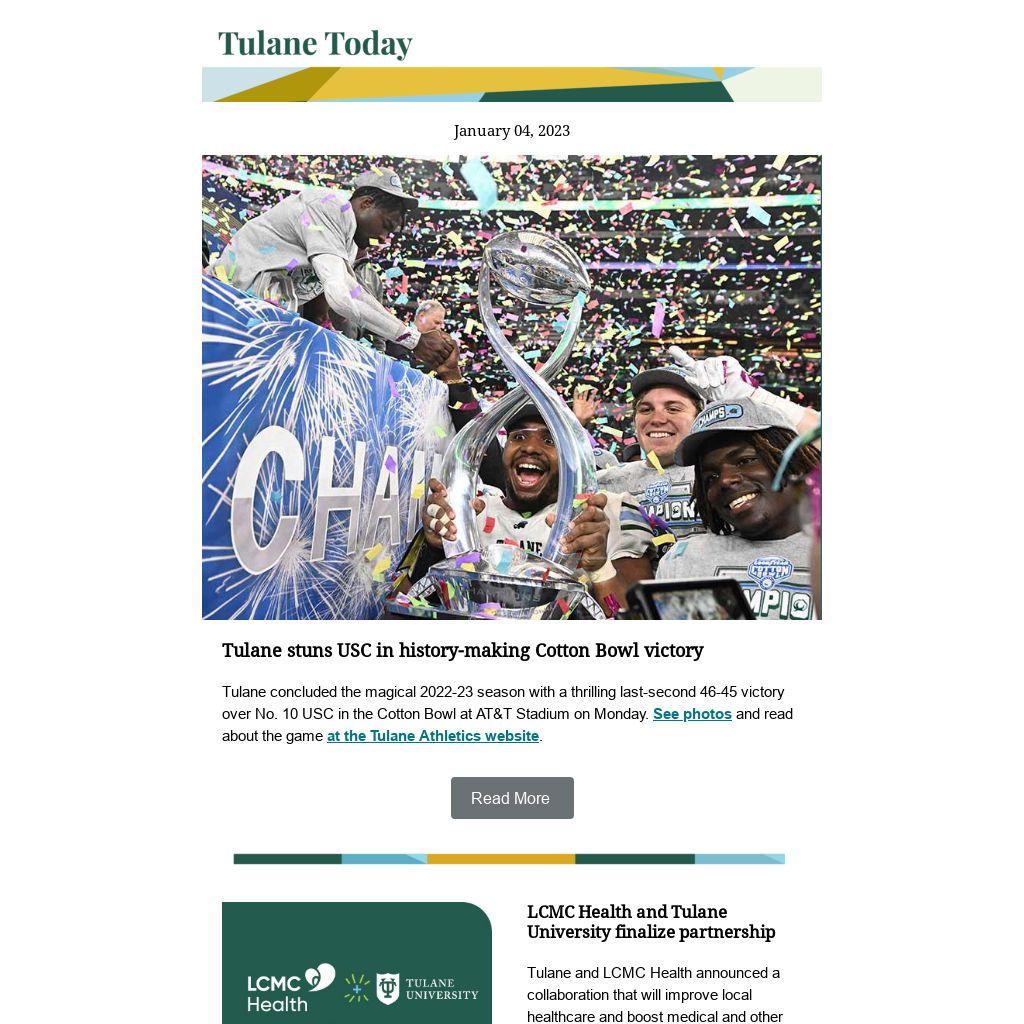 Tulane concluded the magical 2022-23 season with a thrilling last-second 46-45 victory over No. 10 USC in the Cotton Bowl at AT&T Stadium on Monday. See photos and read about the game at the Tulane Athletics website.