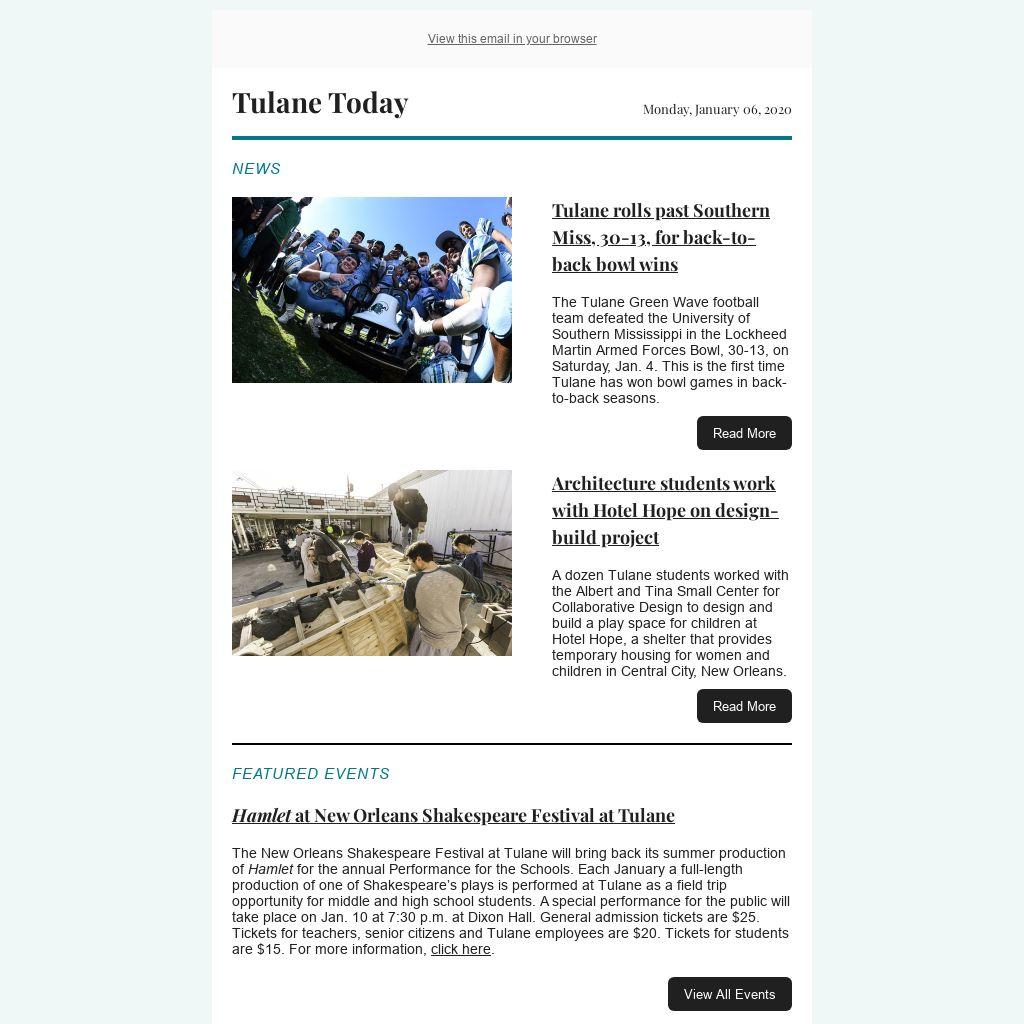 Tulane Today accepts, for consideration, news and event submissions that are of interest to the Tulane community. Items must be 80 words or less and contain contact information and a web link that will be included in the published announcement.