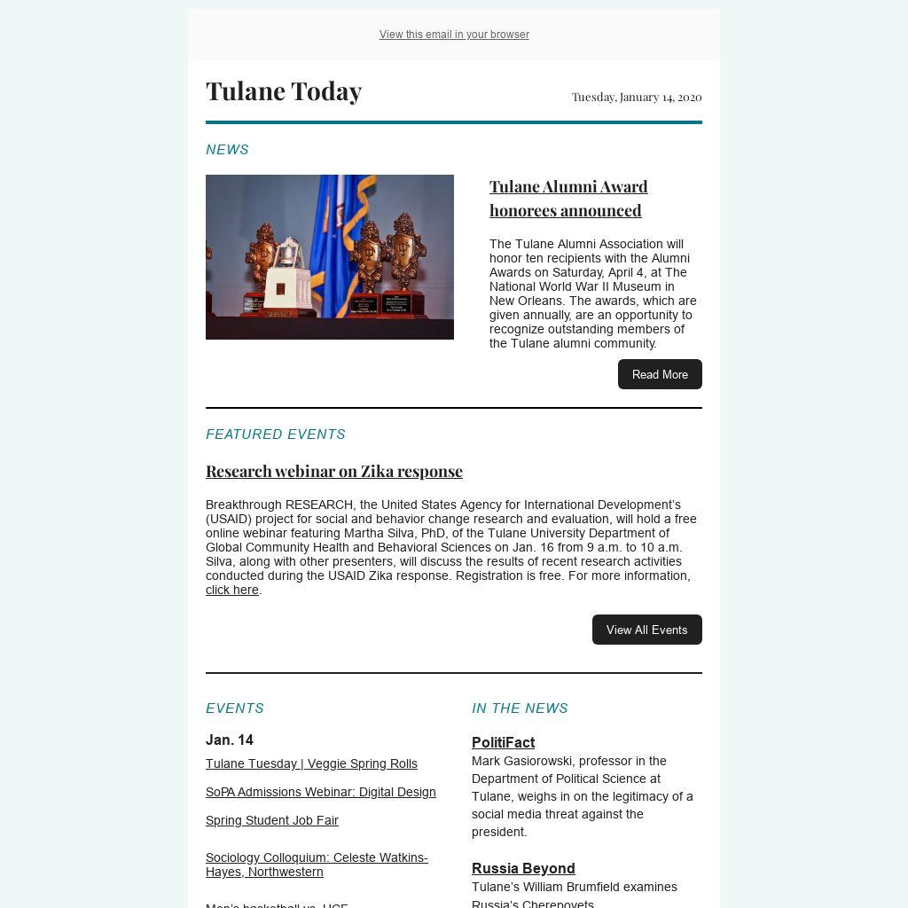 The Tulane Alumni Association will honor ten recipients with the Alumni Awards on Saturday, April 4, at The National World War II Museum in New Orleans. The awards, which are given annually, are an opportunity to recognize outstanding members of the Tulane alumni community.