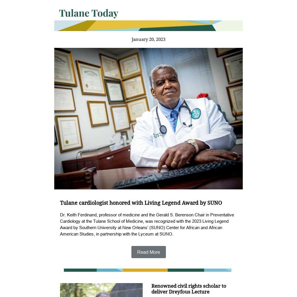 Dr. Keith Ferdinand, professor of medicine and the Gerald S. Berenson Chair in Preventative Cardiology at the Tulane School of Medicine, was recognized with the 2023 Living Legend Award by Southern University at New Orleans’ (SUNO) Center for African and African American Studies, in partnership with the Lyceum at SUNO.