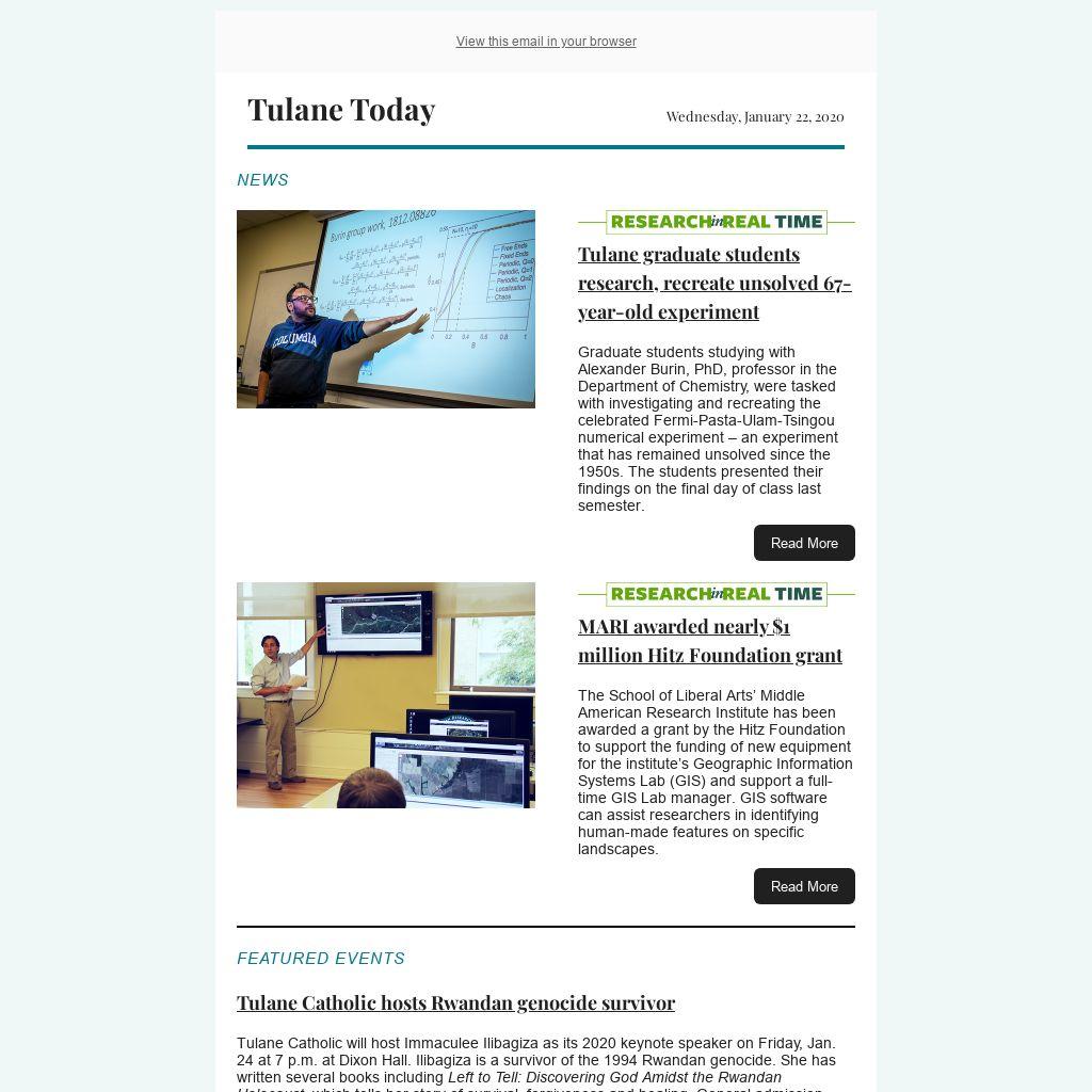 Tulane Today accepts, for consideration, news and event submissions that are of interest to the Tulane community. Items must be 80 words or less and contain contact information and a web link that will be included in the published announcement.