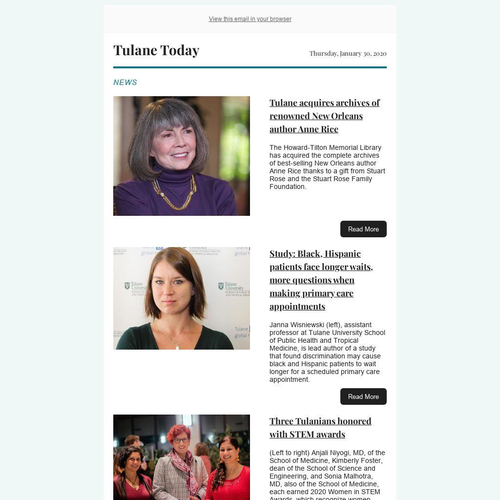 (Left to right) Anjali Niyogi, MD, of the School of Medicine, Kimberly Foster, dean of the School of Science and Engineering, and Sonia Malhotra, MD, also of the School of Medicine, each earned 2020 Women in STEM Awards, which recognize women leaders who have demonstrated exceptional commitment and made an impact across New Orleans in STEM fields.