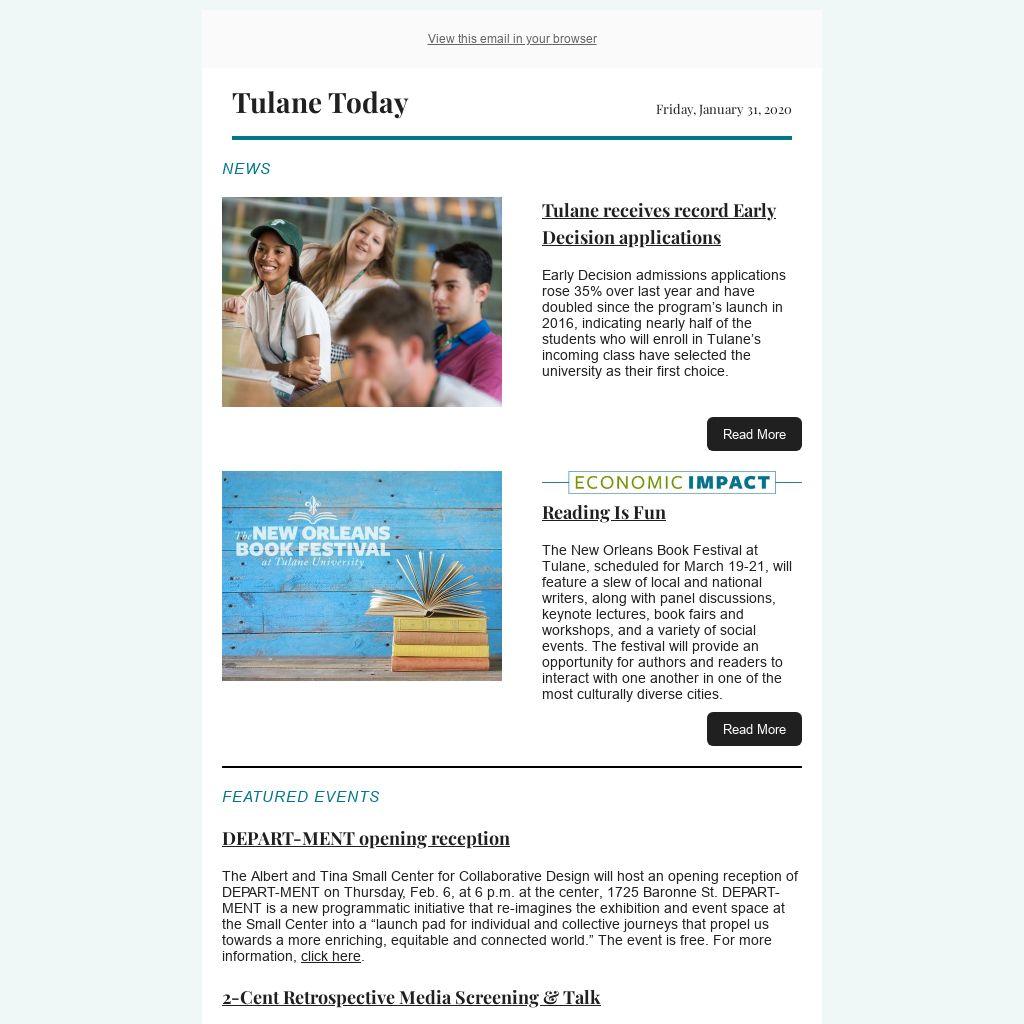 Tulane Today accepts, for consideration, news and event submissions that are of interest to the Tulane community. Items must be 80 words or less and contain contact information and a web link that will be included in the published announcement.
