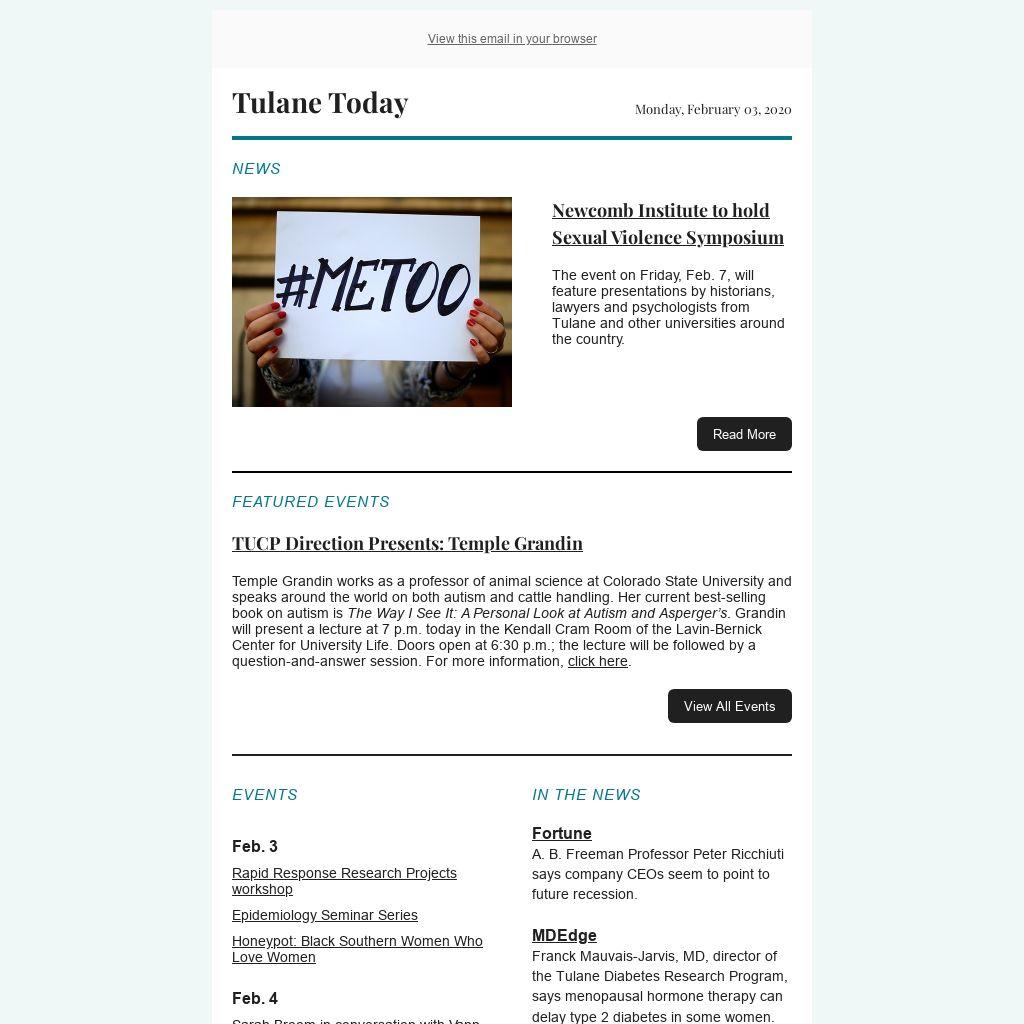 Tulane Today accepts, for consideration, news and event submissions that are of interest to the Tulane community. Items must be 80 words or less and contain contact information and a web link that will be included in the published announcement.