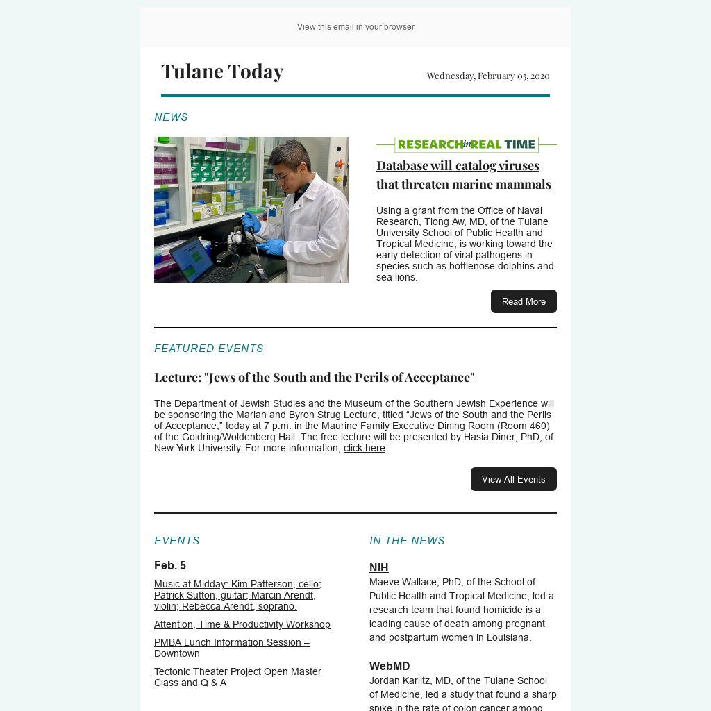 Tulane Today accepts, for consideration, news and event submissions that are of interest to the Tulane community. Items must be 80 words or less and contain contact information and a web link that will be included in the published announcement.