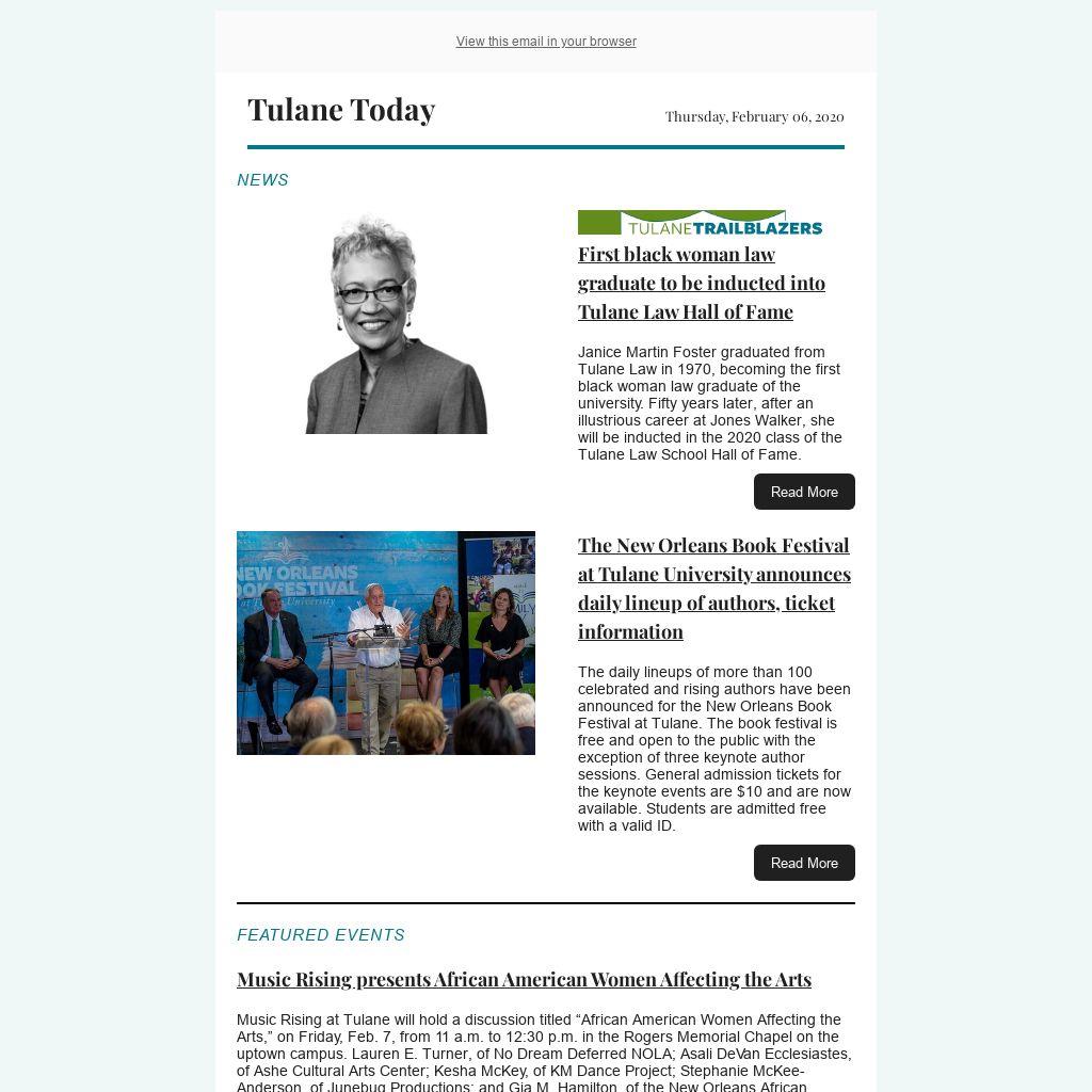 Tulane Today accepts, for consideration, news and event submissions that are of interest to the Tulane community. Items must be 80 words or less and contain contact information and a web link that will be included in the published announcement.