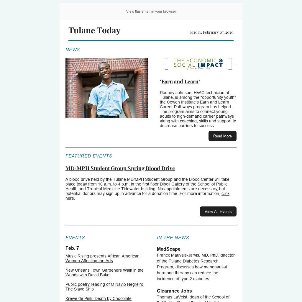 Tulane Today accepts, for consideration, news and event submissions that are of interest to the Tulane community. Items must be 80 words or less and contain contact information and a web link that will be included in the published announcement.