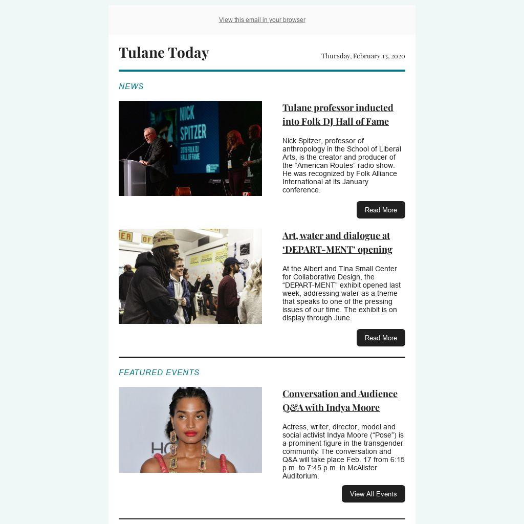 Tulane Today accepts, for consideration, news and event submissions that are of interest to the Tulane community. Items must be 80 words or less and contain contact information and a web link that will be included in the published announcement.