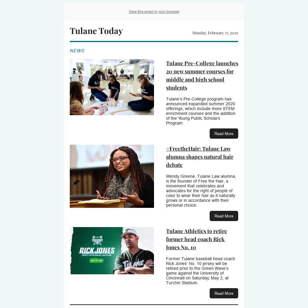 Tulane Today accepts, for consideration, news and event submissions that are of interest to the Tulane community. Items must be 80 words or less and contain contact information and a web link that will be included in the published announcement.