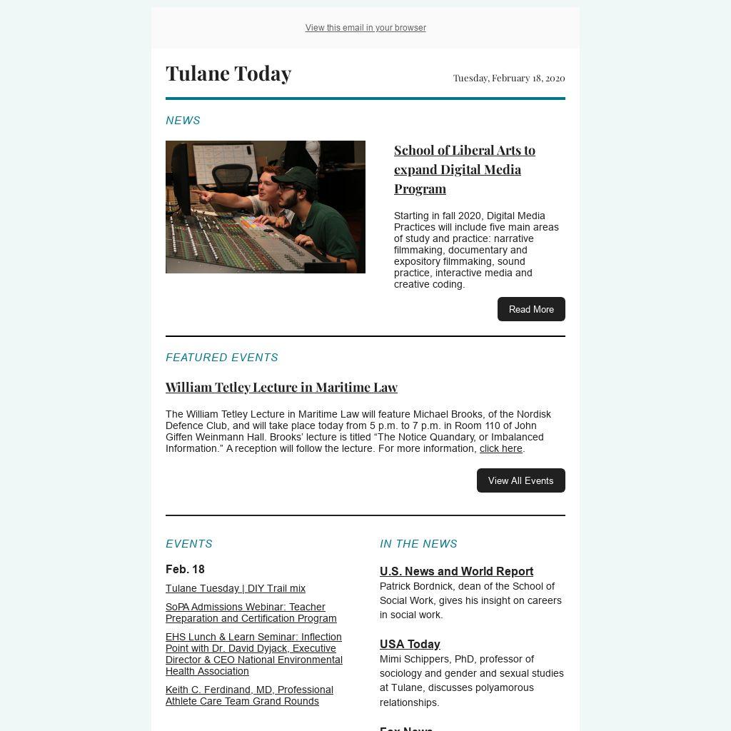 Tulane Today accepts, for consideration, news and event submissions that are of interest to the Tulane community. Items must be 80 words or less and contain contact information and a web link that will be included in the published announcement.