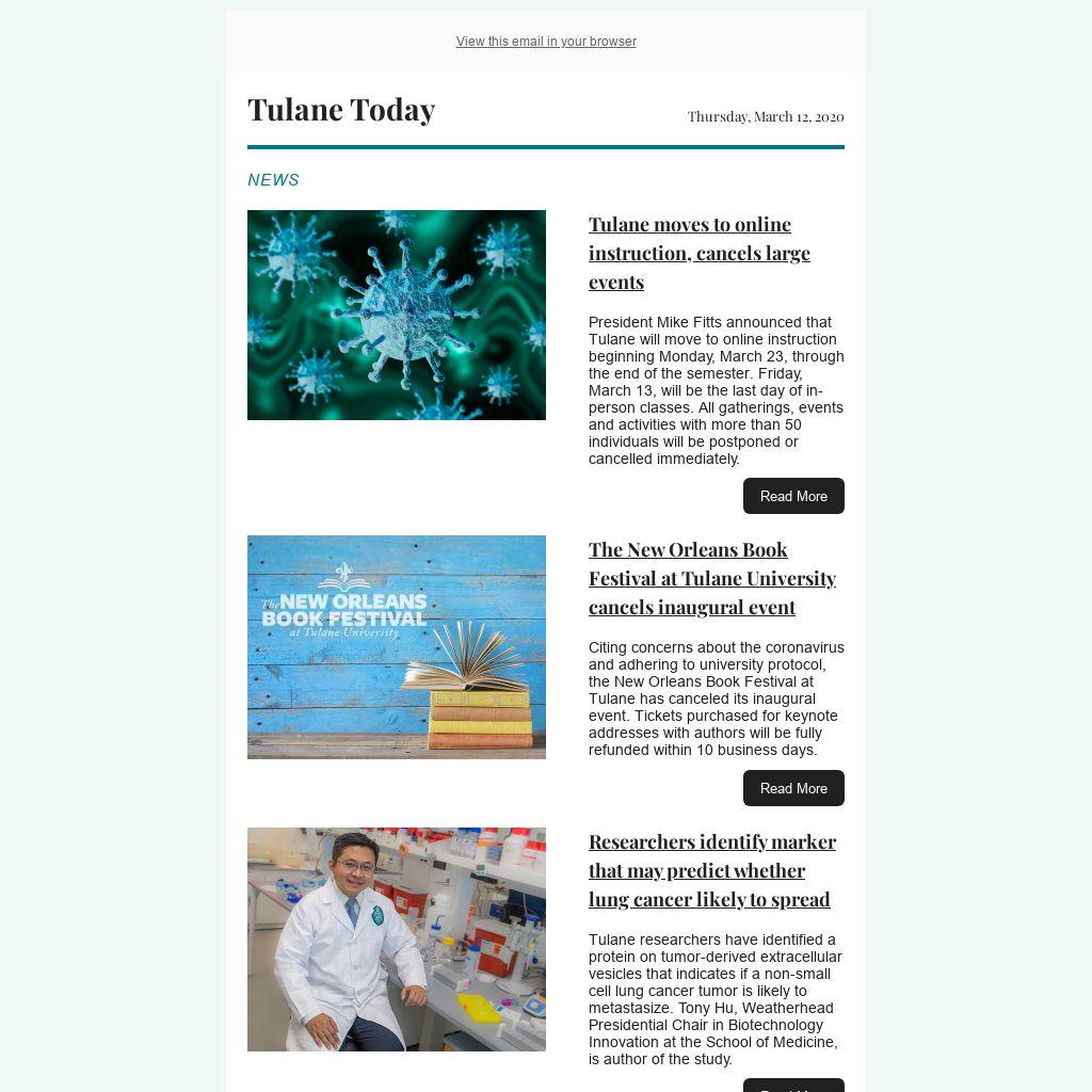 President Mike Fitts announced that Tulane will move to online instruction beginning Monday, March 23, through the end of the semester. Friday, March 13, will be the last day of in-person classes. All gatherings, events and activities with more than 50 individuals will be postponed or cancelled immediately.