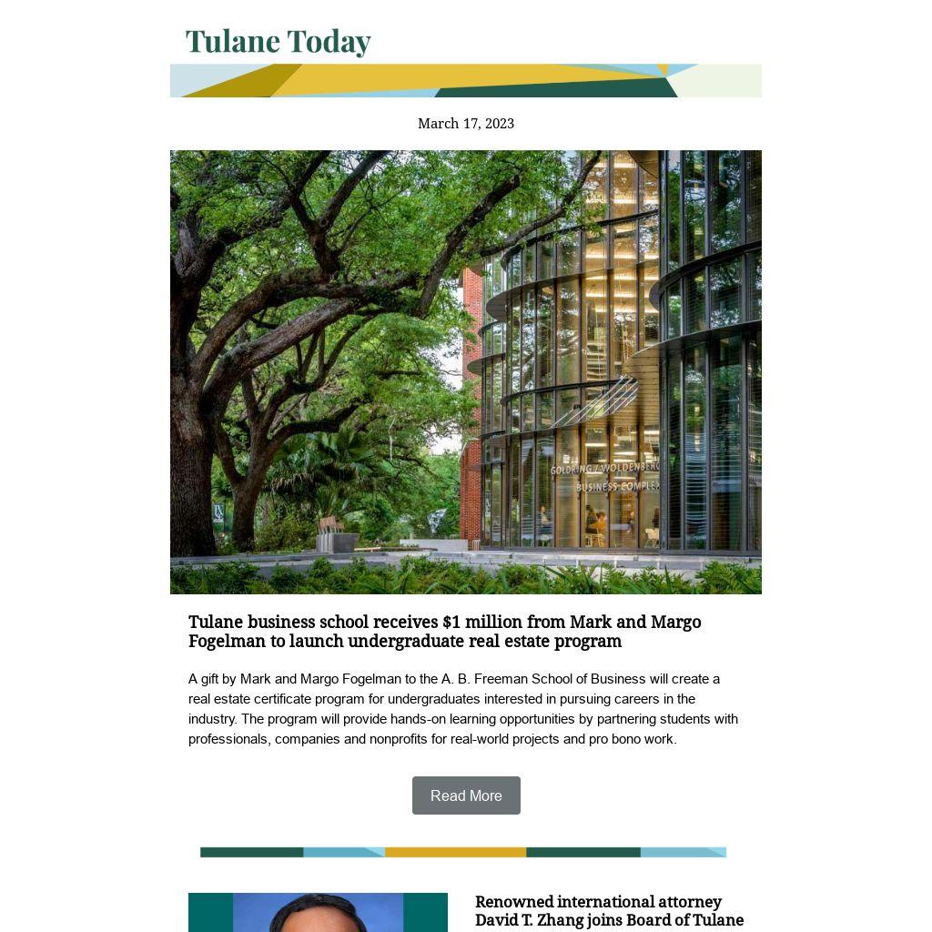 David T. Zhang, a prominent international lawyer, has joined the Board of Tulane, the university’s main governing body. Zhang, who is a Tulane Law School alumnus, is a senior partner in the U.S. firm Kirkland & Ellis LLP, one of the most prominent law firms in the country. Read more on the Tulane News website.