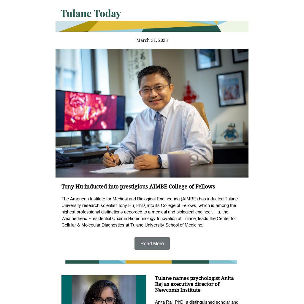 The American Institute for Medical and Biological Engineering (AIMBE) has inducted Tulane University research scientist Tony Hu, PhD, into its College of Fellows, which is among the highest professional distinctions accorded to a medical and biological engineer. Hu, the Weatherhead Presidential Chair in Biotechnology Innovation at Tulane, leads the Center for Cellular & Molecular Diagnostics at Tulane University School of Medicine.