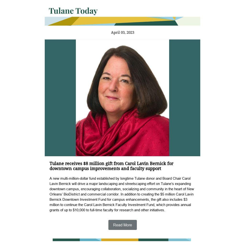 A new multi-million-dollar fund established by longtime Tulane donor and Board Chair Carol Lavin Bernick will drive a major landscaping and streetscaping effort on Tulane’s expanding downtown campus, encouraging collaboration, socializing and community in the heart of New Orleans’ BioDistrict and commercial corridor. In addition to creating the $5 million Carol Lavin Bernick Downtown Investment Fund for campus enhancements, the gift also includes $3 million to continue the Carol Lavin Bernick Faculty Investment Fund, which provides annual grants of up to $10,000 to full-time faculty for research and other initiatives.