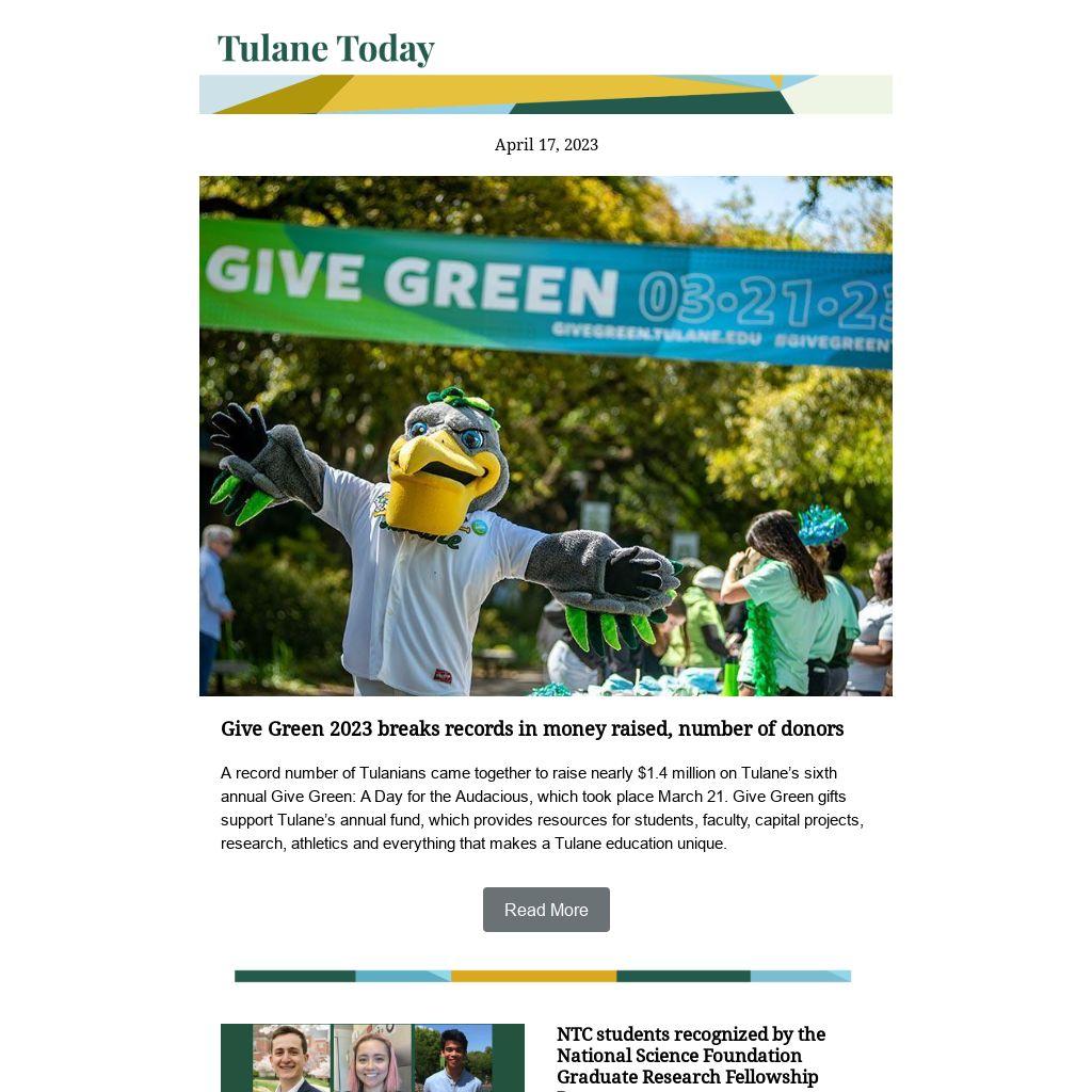 A record number of Tulanians came together to raise nearly $1.4 million on Tulane’s sixth annual Give Green: A Day for the Audacious, which took place March 21. Give Green gifts support Tulane’s annual fund, which provides resources for students, faculty, capital projects, research, athletics and everything that makes a Tulane education unique.
