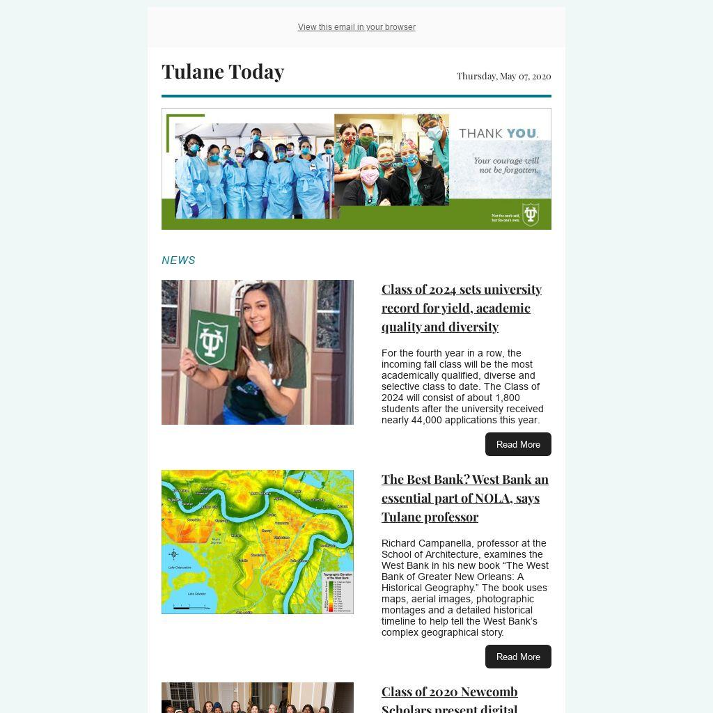 Tulane Today accepts, for consideration, news and event submissions that are of interest to the Tulane community. Items must be 80 words or less and contain contact information and a web link that will be included in the published announcement.