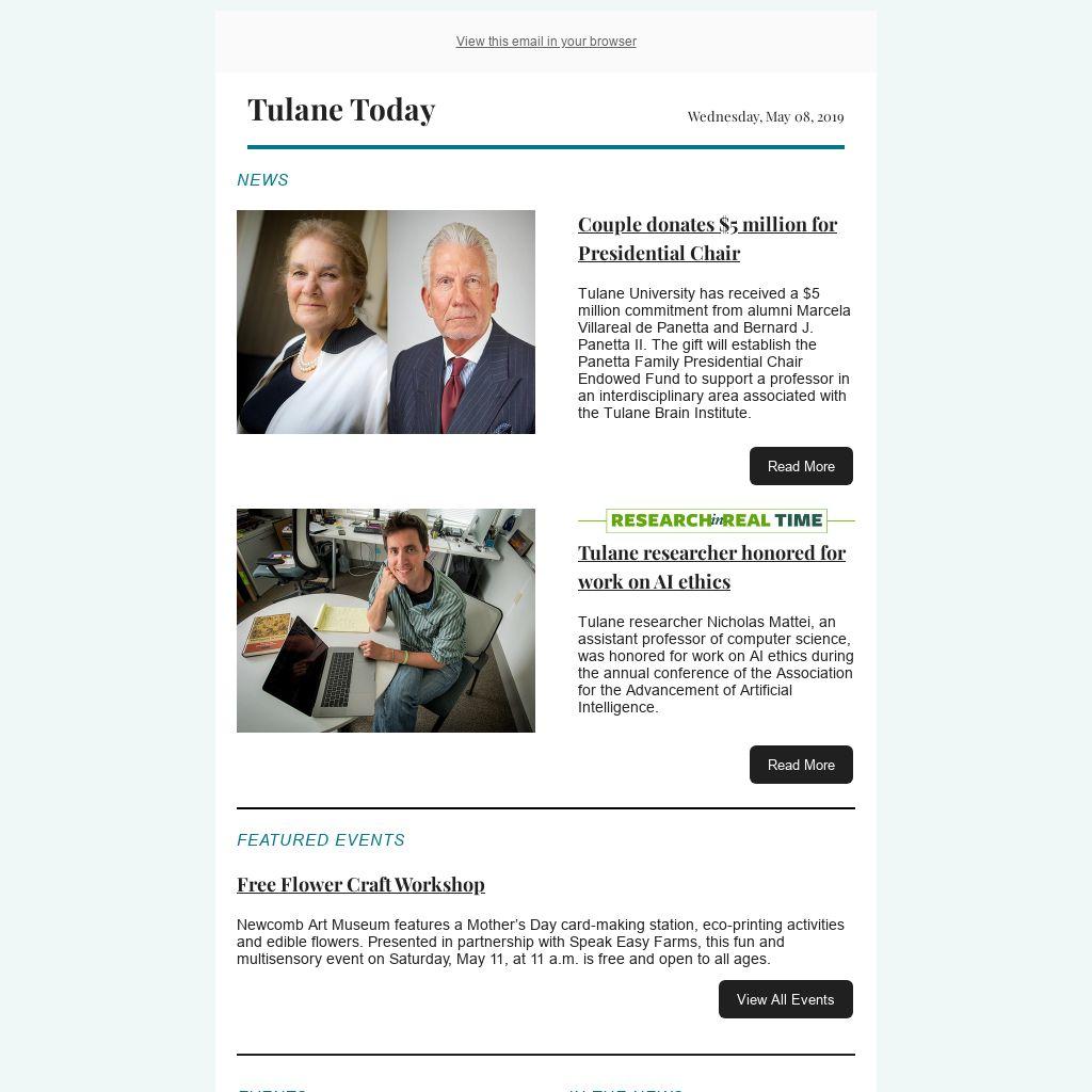 Tulane Today accepts, for consideration, news and event submissions that are of interest to the Tulane community. Items must be 80 words or less and contain contact information and a web link that will be included in the published announcement.