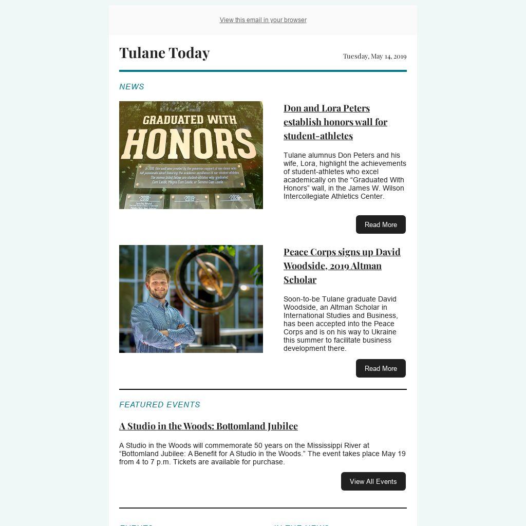 Tulane Today accepts, for consideration, news and event submissions that are of interest to the Tulane community. Items must be 80 words or less and contain contact information and a web link that will be included in the published announcement.
