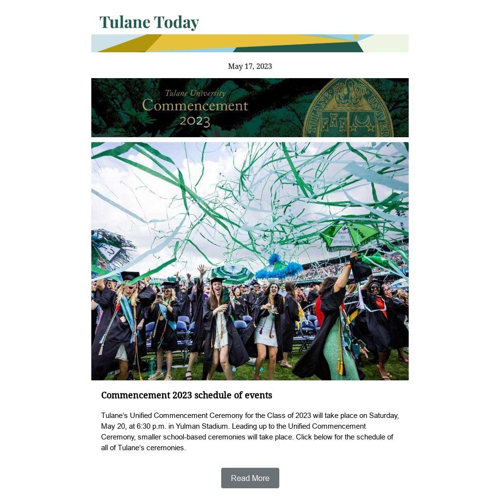 Tulane’s Unified Commencement Ceremony for the Class of 2023 will take place on Saturday, May 20, at 6:30 p.m. in Yulman Stadium. Leading up to the Unified Commencement Ceremony, smaller school-based ceremonies will take place. Click below for the schedule of all of Tulane’s ceremonies.