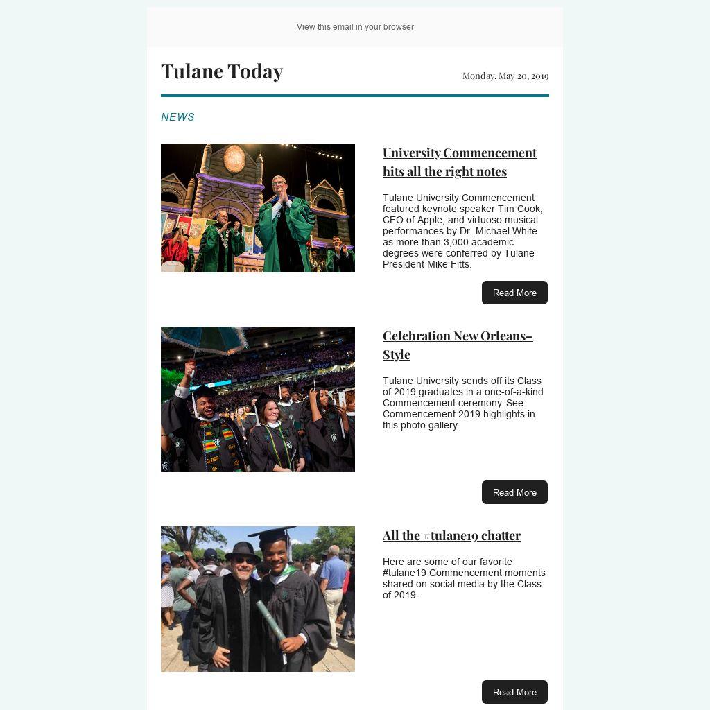 Tulane University sends off its Class of 2019 graduates in a one-of-a-kind Commencement ceremony. See Commencement 2019 highlights in this photo gallery.