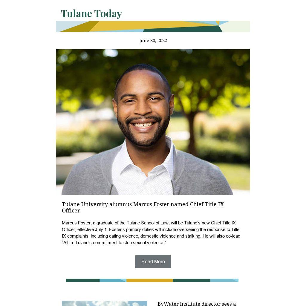 Marcus Foster, a graduate of the Tulane School of Law, will be Tulane’s new Chief Title IX Officer, effective July 1. Foster’s primary duties will include overseeing the response to Title IX complaints, including dating violence, domestic violence and stalking. He will also co-lead “All In: Tulane's commitment to stop sexual violence.”