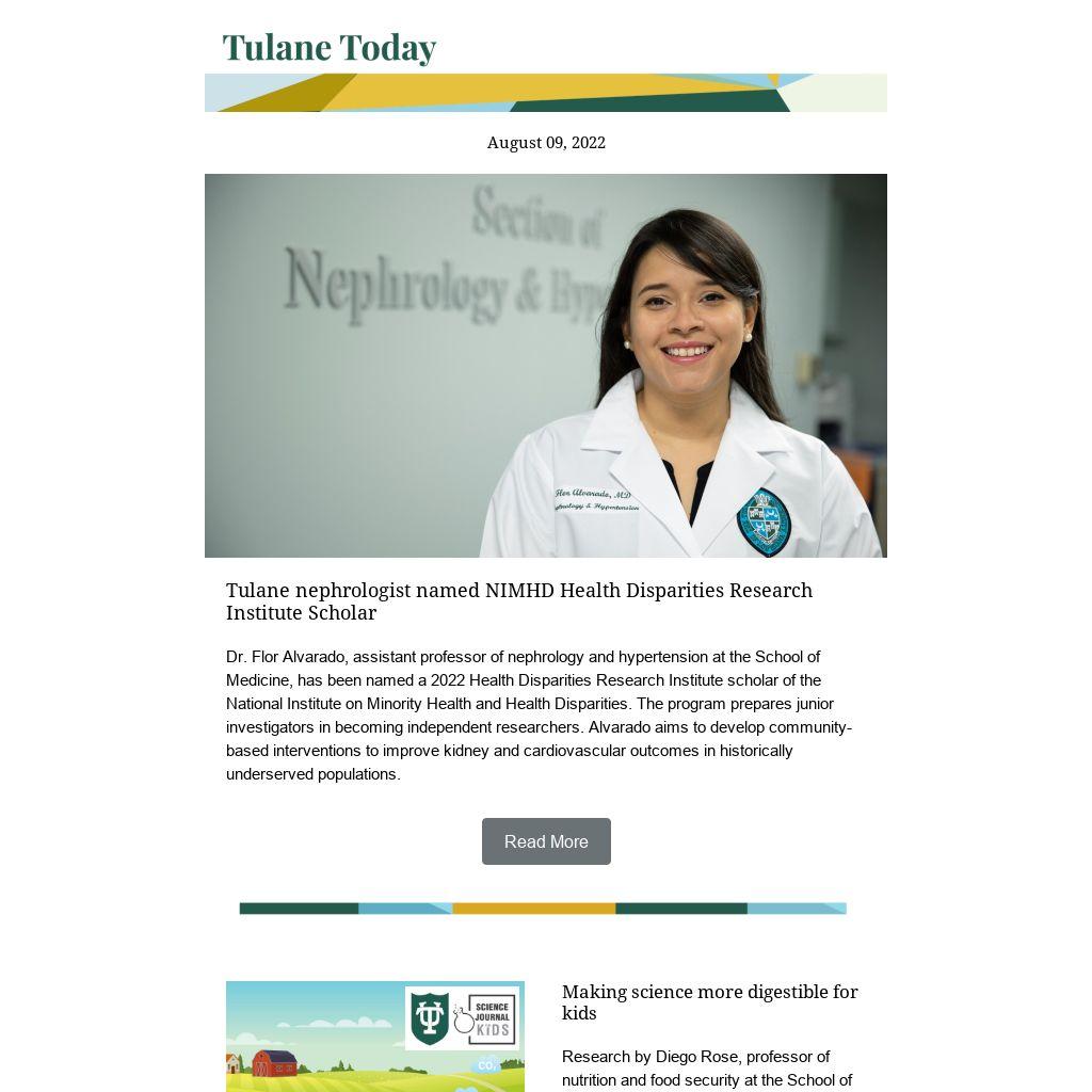 Research by Diego Rose, professor of nutrition and food security at the School of Public Health and Tropical Medicine, is making science more palatable for kids. Rose and his colleagues’ work on how to make diets more planet-friendly is included in the Science Journal for Kids, which makes science accessible and easy to read for students, from kindergarten through high school. The team’s research was translated into a colorful article with graphics, key points, discussion questions and a glossary. Read More