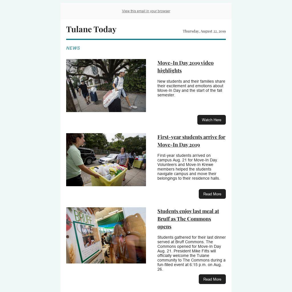 Tulane Today accepts, for consideration, news and event submissions that are of interest to the Tulane community. Items must be 80 words or less and contain contact information and a web link that will be included in the published announcement.