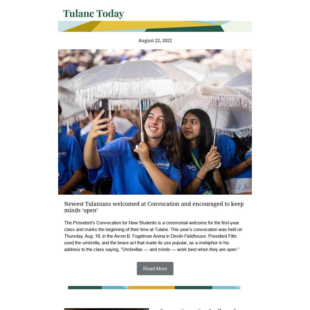 The President’s Convocation for New Students is a ceremonial welcome for the first-year class and marks the beginning of their time at Tulane. This year’s convocation was held on Thursday, Aug. 18, in the Avron B. Fogelman Arena in Devlin Fieldhouse. President Fitts used the umbrella, and the brave act that made its use popular, as a metaphor in his address to the class saying, “Umbrellas — and minds — work best when they are open.”