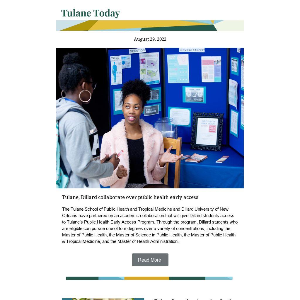 The Tulane School of Public Health and Tropical Medicine and Dillard University of New Orleans have partnered on an academic collaboration that will give Dillard students access to Tulane’s Public Health Early Access Program. Through the program, Dillard students who are eligible can pursue one of four degrees over a variety of concentrations, including the Master of Public Health, the Master of Science in Public Health, the Master of Public Health & Tropical Medicine, and the Master of Health Administration.