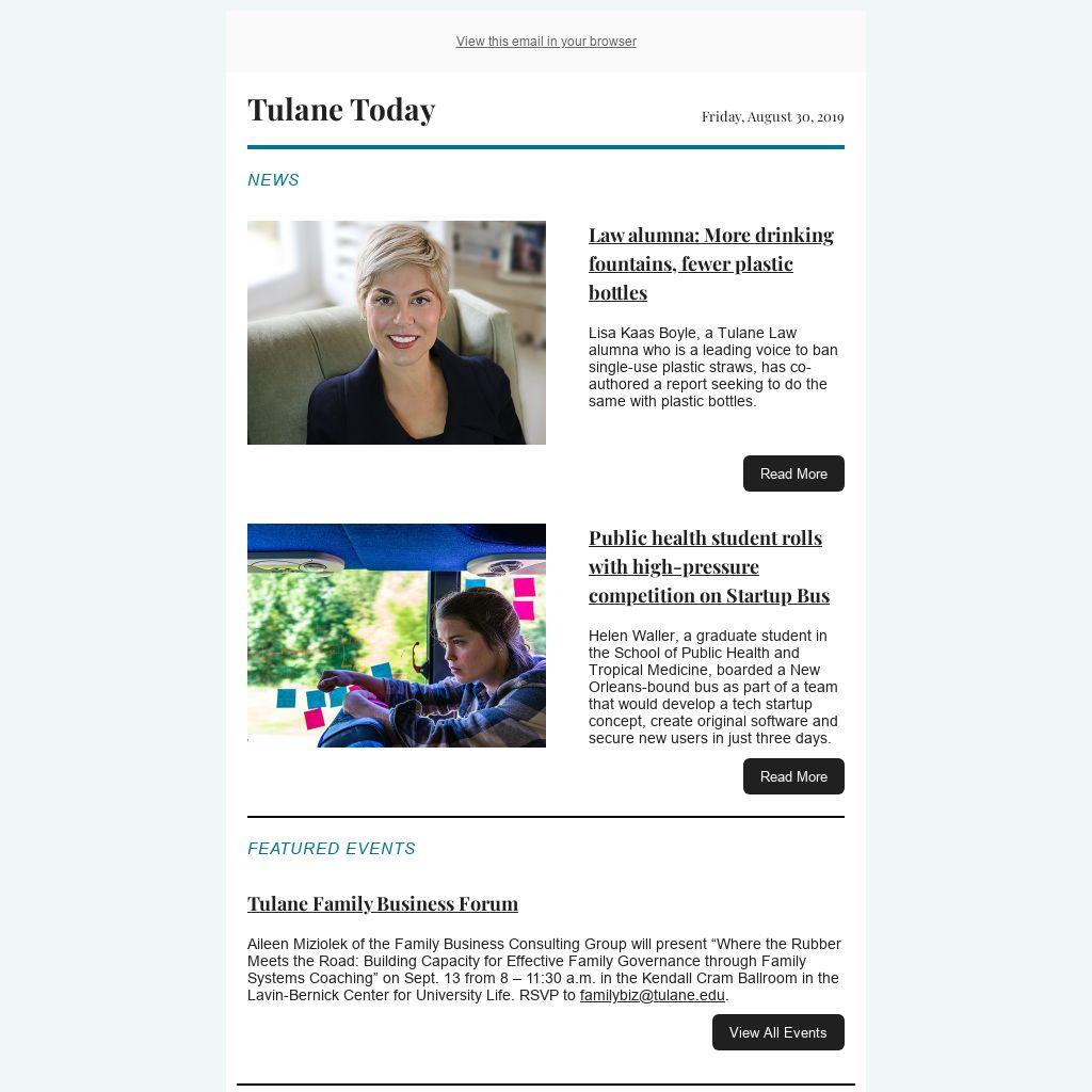 Tulane Today accepts, for consideration, news and event submissions that are of interest to the Tulane community. Items must be 80 words or less and contain contact information and a web link that will be included in the published announcement.