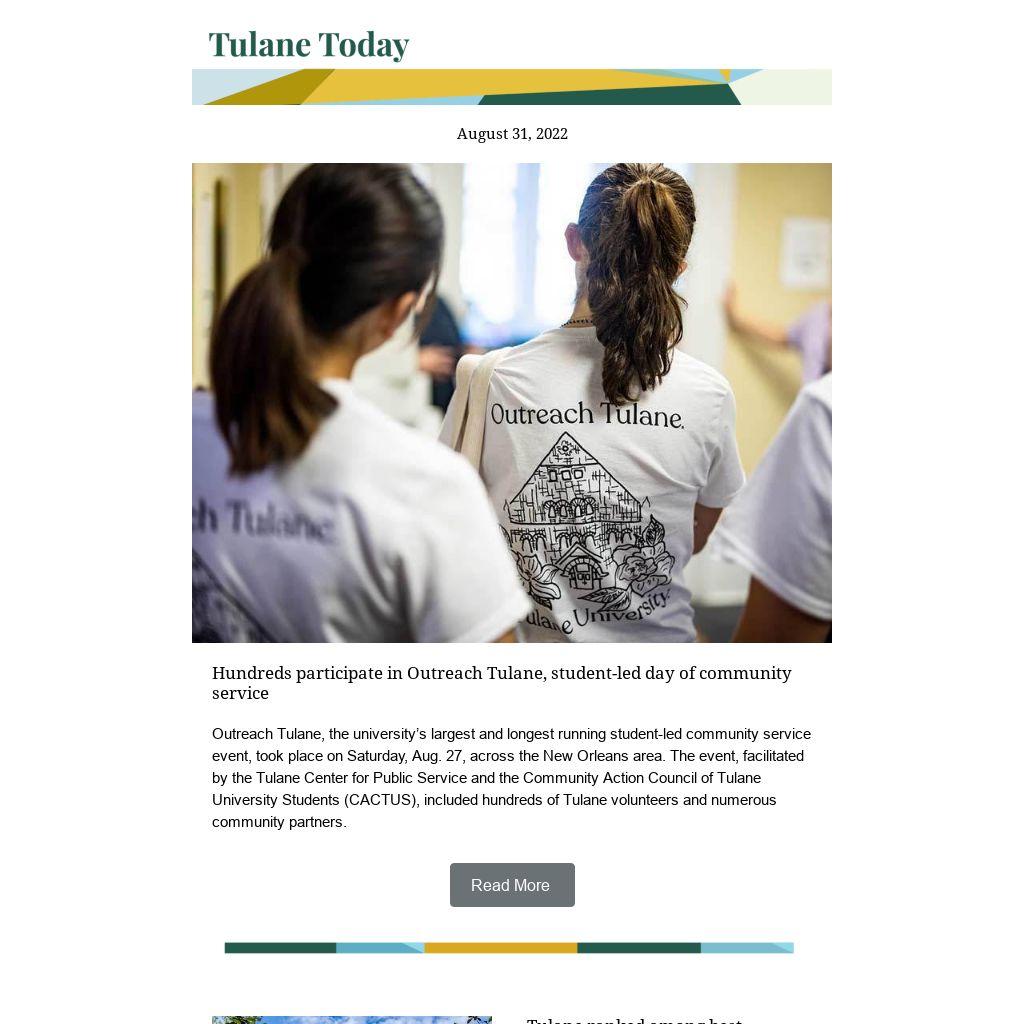 Tulane Today accepts, for consideration, news and event submissions that are of interest to the Tulane community. Items must be 80 words or less and contain contact information and a web link that will be included in the published announcement.