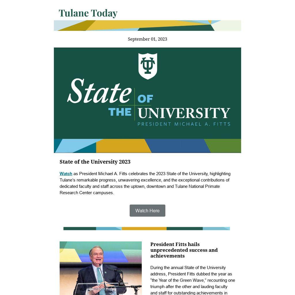 Watch as President Michael A. Fitts celebrates the 2023 State of the University, highlighting Tulane’s remarkable progress, unwavering excellence, and the exceptional contributions of dedicated faculty and staff across the uptown, downtown and Tulane National Primate Research Center campuses.