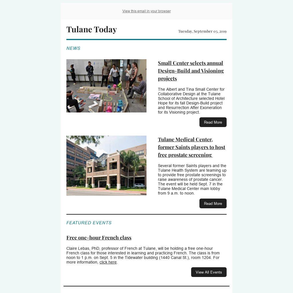 Tulane Today accepts, for consideration, news and event submissions that are of interest to the Tulane community. Items must be 80 words or less and contain contact information and a web link that will be included in the published announcement.