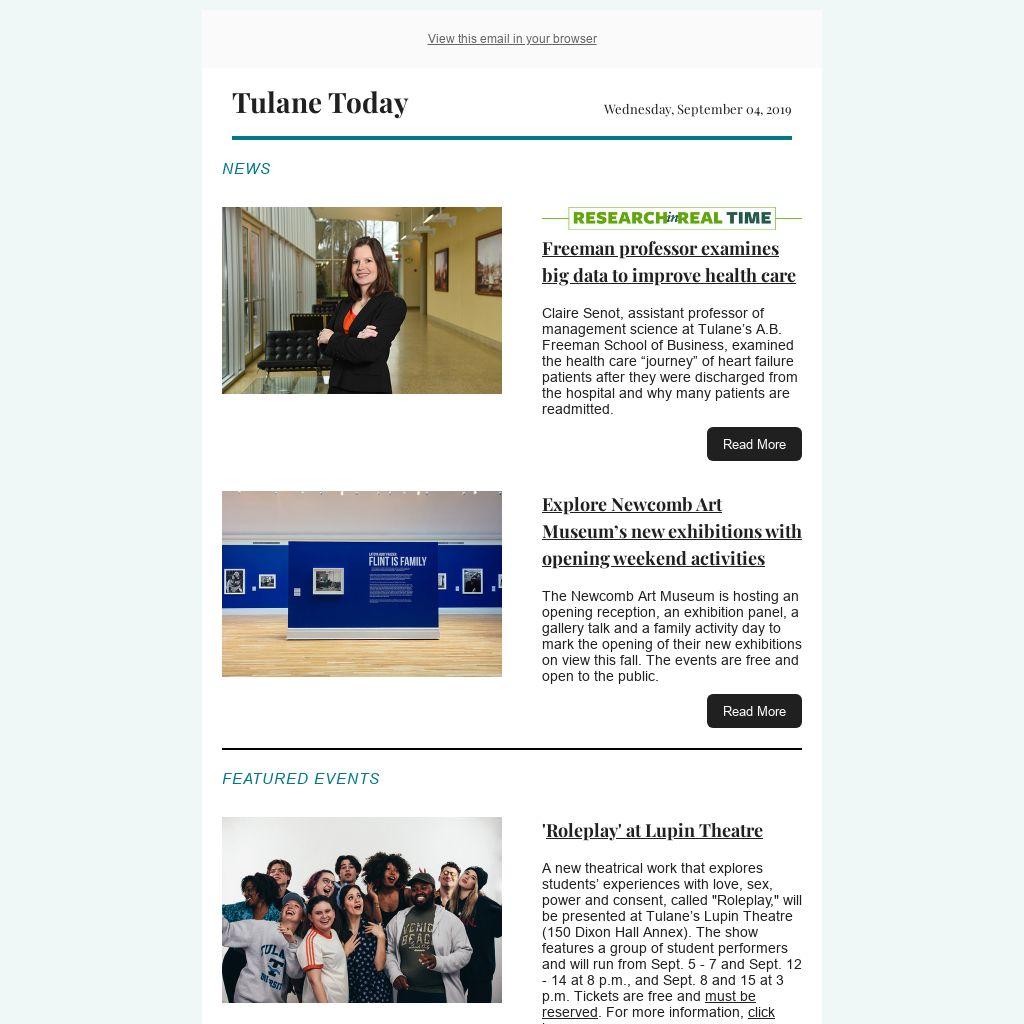 Tulane Today accepts, for consideration, news and event submissions that are of interest to the Tulane community. Items must be 80 words or less and contain contact information and a web link that will be included in the published announcement.