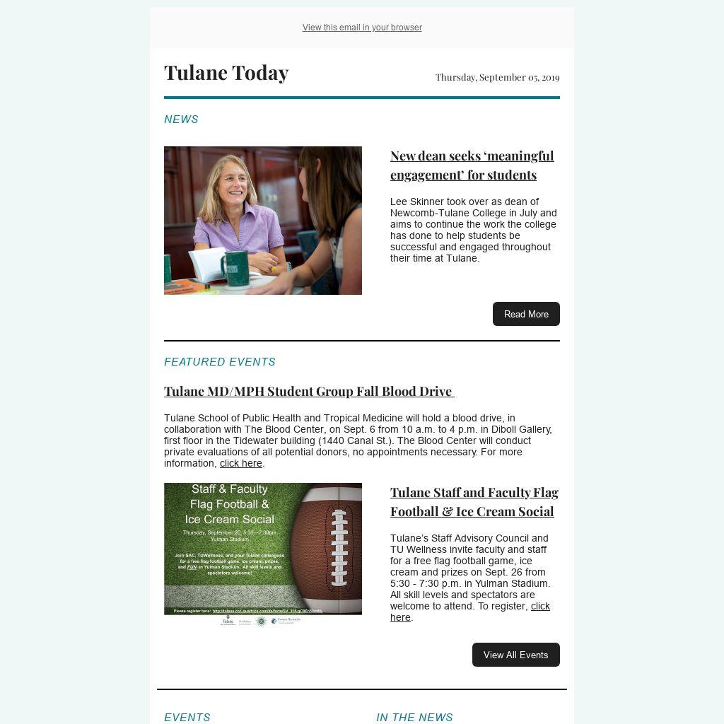 Tulane’s Staff Advisory Council and TU Wellness invite faculty and staff for a free flag football game, ice cream and prizes on Sept. 26 from 5:30 - 7:30 p.m. in Yulman Stadium. All skill levels and spectators are welcome to attend. To register, click here.