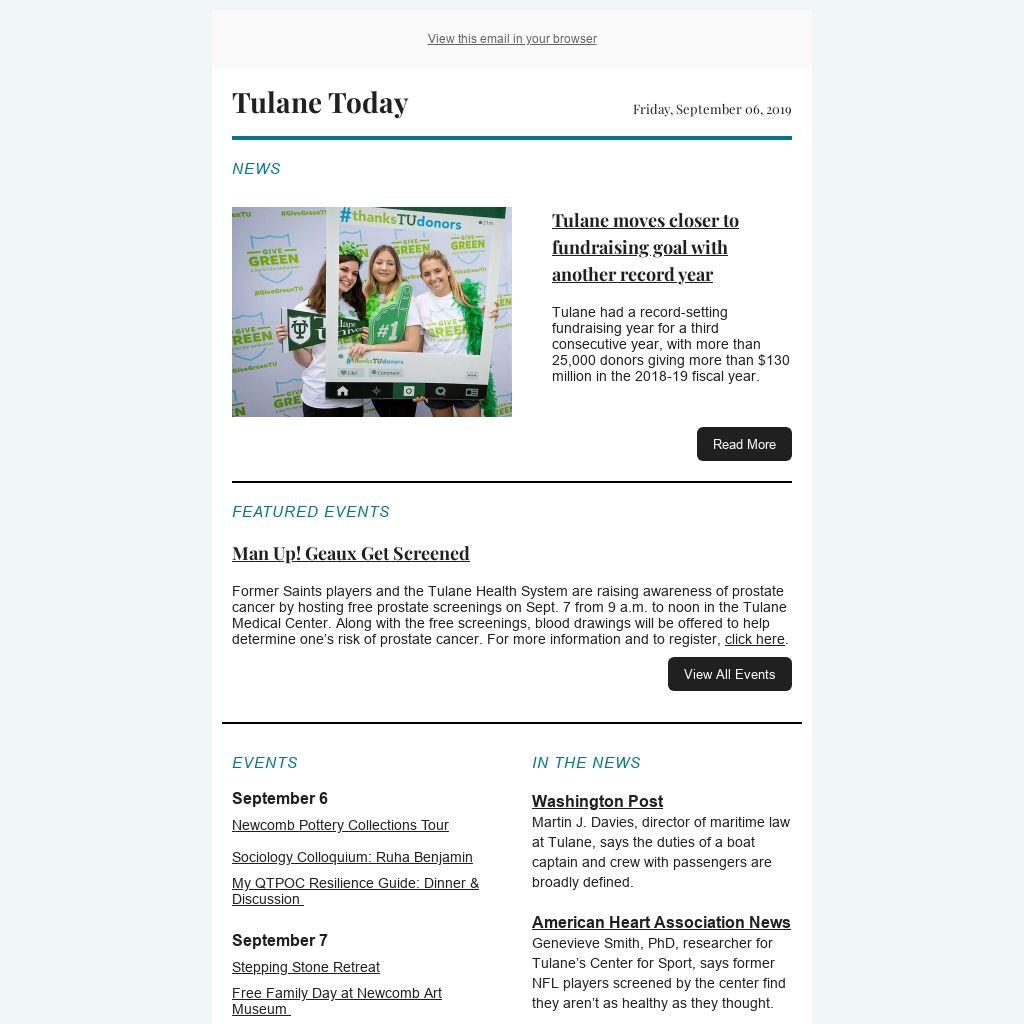 Tulane Today accepts, for consideration, news and event submissions that are of interest to the Tulane community. Items must be 80 words or less and contain contact information and a web link that will be included in the published announcement.