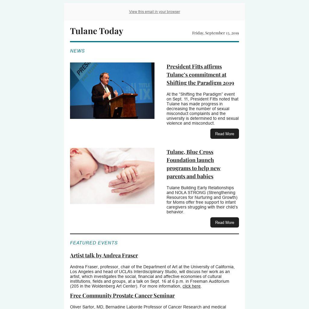 Tulane Today accepts, for consideration, news and event submissions that are of interest to the Tulane community. Items must be 80 words or less and contain contact information and a web link that will be included in the published announcement.