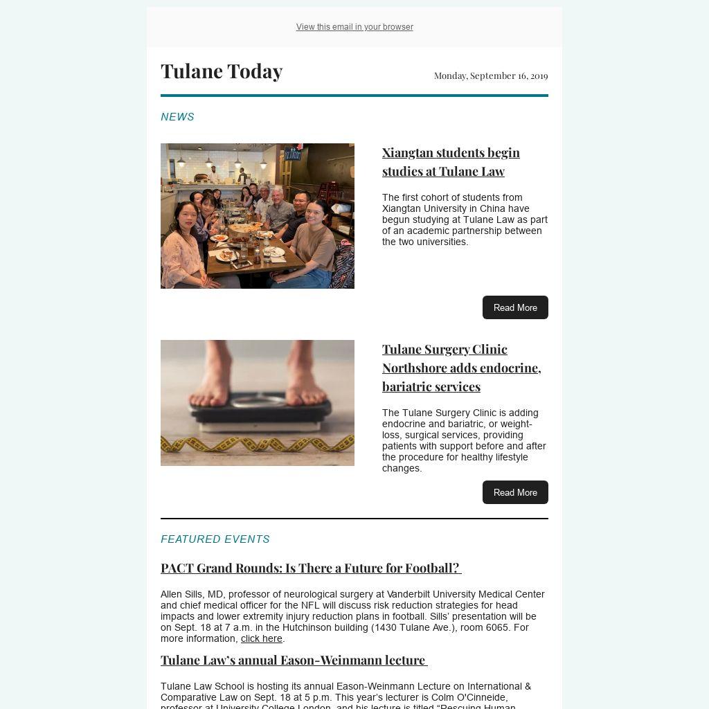 Tulane Today accepts, for consideration, news and event submissions that are of interest to the Tulane community. Items must be 80 words or less and contain contact information and a web link that will be included in the published announcement.