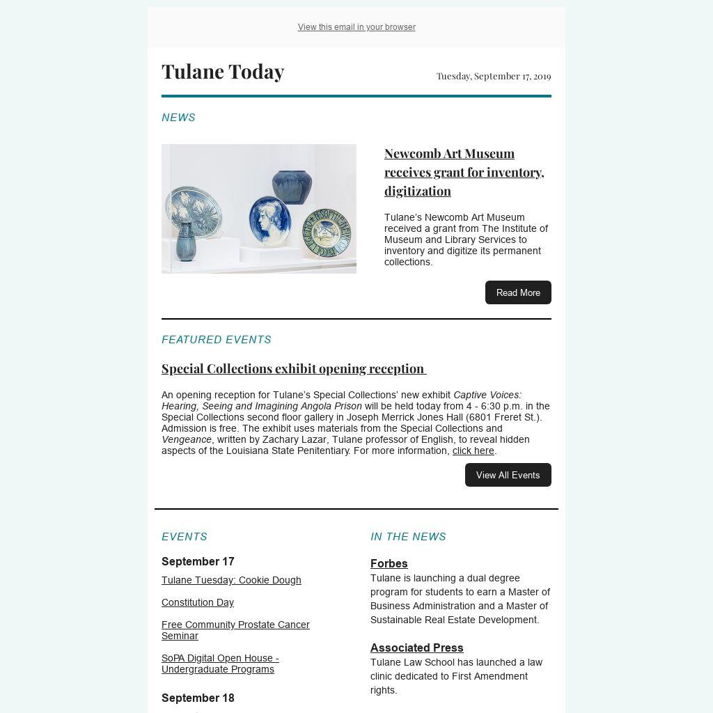 Tulane Today accepts, for consideration, news and event submissions that are of interest to the Tulane community. Items must be 80 words or less and contain contact information and a web link that will be included in the published announcement.