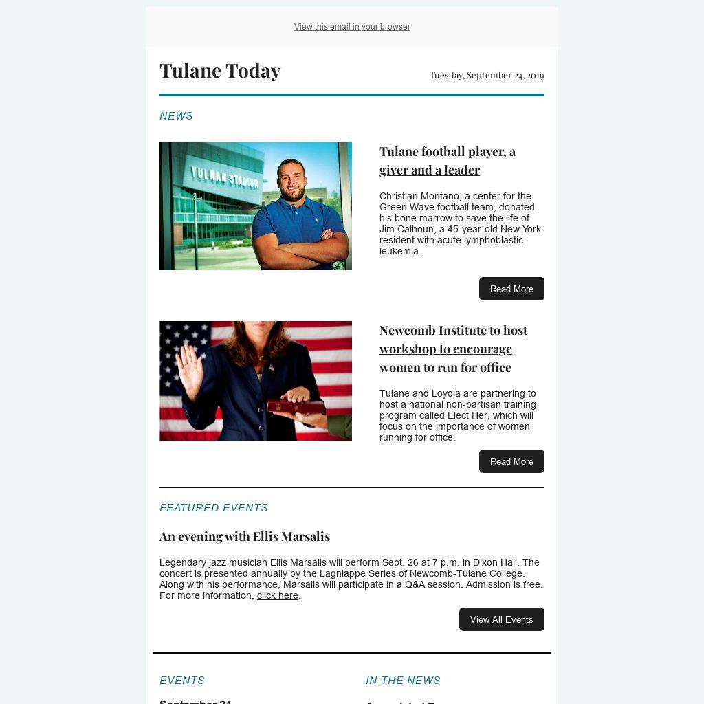 Tulane Today accepts, for consideration, news and event submissions that are of interest to the Tulane community. Items must be 80 words or less and contain contact information and a web link that will be included in the published announcement.