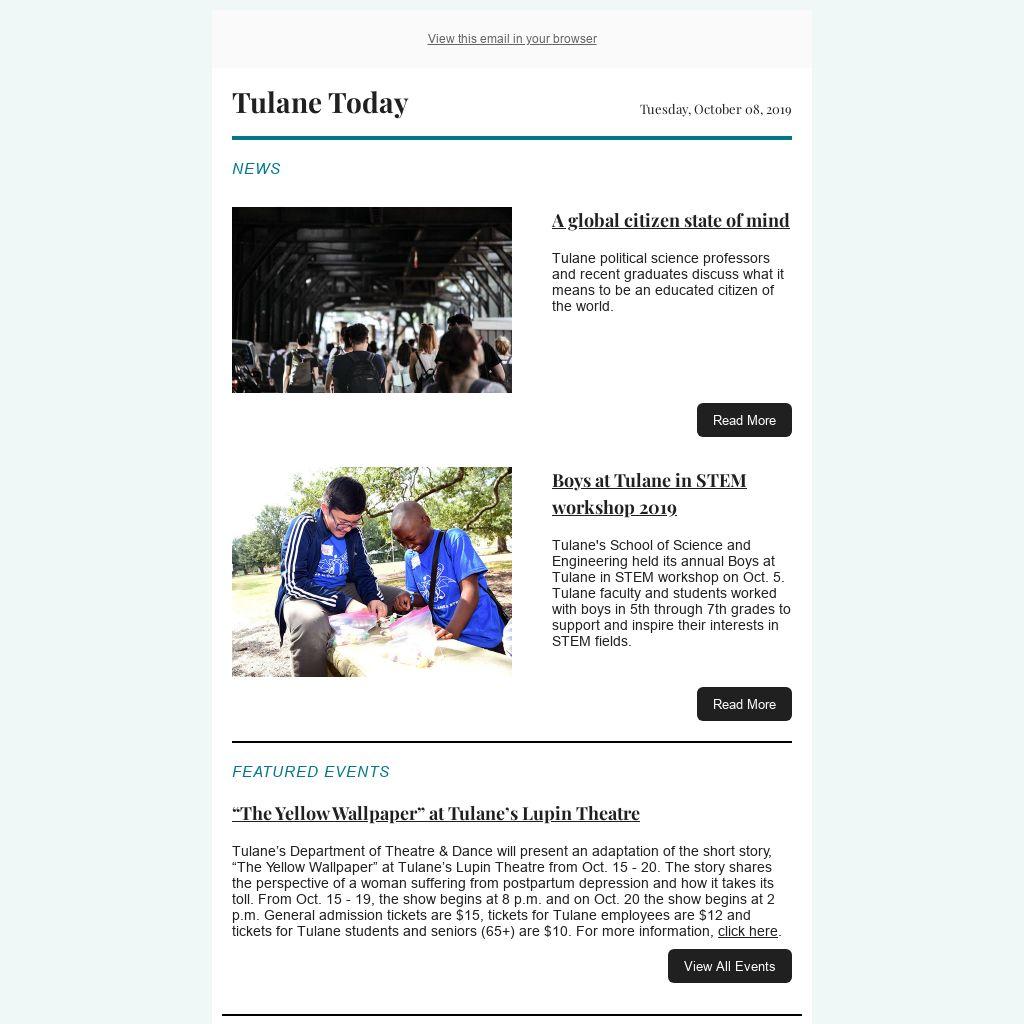 Tulane Today accepts, for consideration, news and event submissions that are of interest to the Tulane community. Items must be 80 words or less and contain contact information and a web link that will be included in the published announcement.