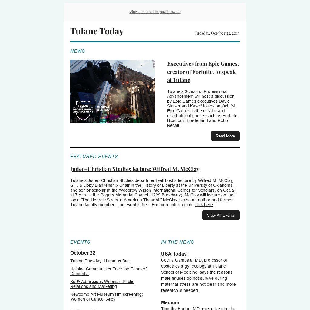 Tulane Today accepts, for consideration, news and event submissions that are of interest to the Tulane community. Items must be 80 words or less and contain contact information and a web link that will be included in the published announcement.